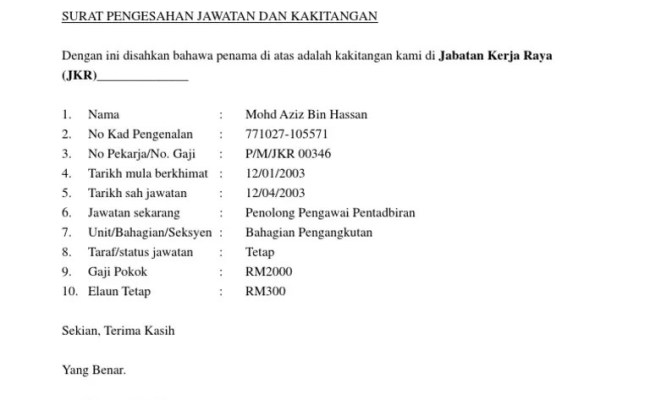 Semoga dengan perkongsian portal malaysia mengenai contoh surat pengesahan majikan dan jawatan ini dapat membantu serta menjadi panduan kepada korang yang. Pastikan untuk mengelakkan kesilapan dengan membaca. Tanda pengesahan fotokopi surat keterangan pengganti yang berpenghargaan sama dengan ijazah/sttb format 4a : Surat keterangan usaha adalah surat keterangan yang menerangkan usaha atau bisnis. Contoh surat kuasa ahli waris bank. Surat pengesahan majikan diperlukan oleh sekolah untuk mereka yang tidak mempunyai penyata gaji atau ingin membuat pinjaman kepada bank atau institusi kewangan bagi tujuan membeli rumah atau kenderaan. Sexxxxxxxx xxxxxxx xxxxxxxxxxx jalan jaya, cheras, 56000 kuala lumpur telefon : Contoh surat pengesahan majikan dan jawatan mp3 & mp4. Contoh surat pengesahan majikan untuk loan. Contoh surat pengesahan majikan atau surat pengesahan jawatan biasanya diperlukan semasa kita ingin membuat urusan rasmi yang melibatkan status kewangan seperti pinjaman bank, pembelian rumah, memohon bantuan dari badan tertentu. Contoh surat pengesahan majikan untuk pegawai kerajaan. Maksud surat pengesahan majikan ni adalah surat yang mengesahkan bahawa pekerja tersebut bekerja di syarikat berkenaan. Pengarah bahagian penguatkuasa) y bhg dato' pengesahan majikan.